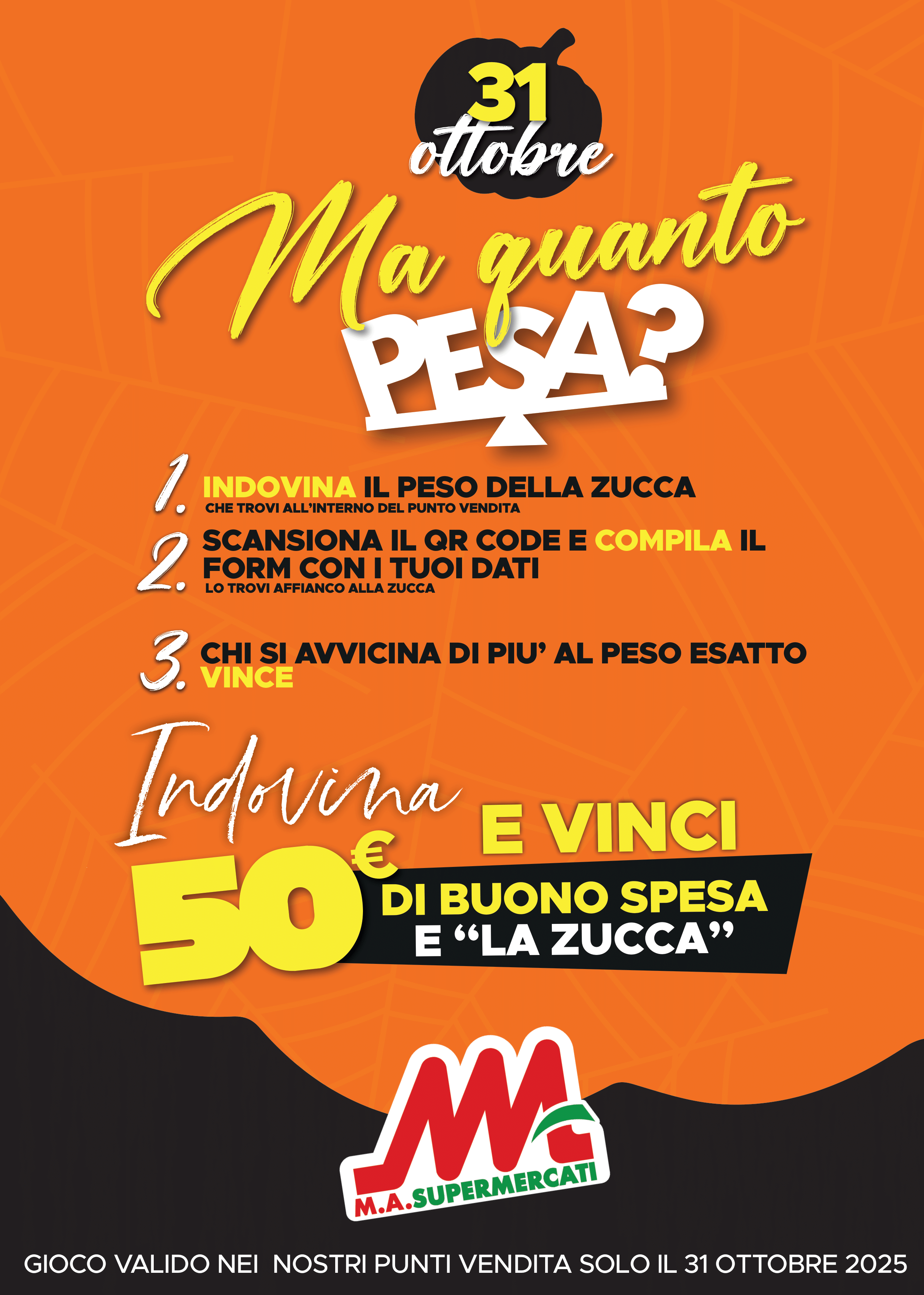 Per Vincere è necessario inserire IL NOME E il COGNOME corrispondenti alla registrazione nella nostra area riservata. Il vincitore potrà così essere contattato privatamente sulla mail associata al suo account e riceverà il buono di 50€ come coupon spendibile entro il 30 novembre 2025 nel punto vendita di riferimento in un unica soluzione e potrà ritirare la zucca direttamente nel punto vendita.